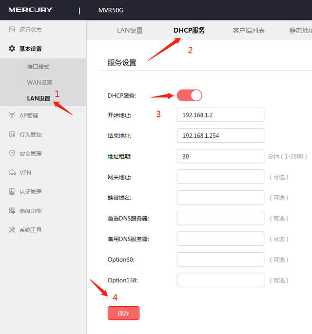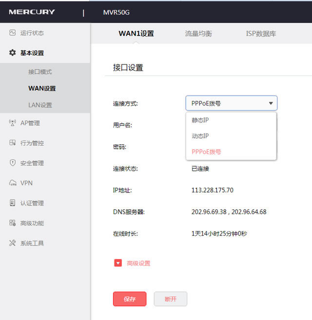水星MVR50G全千兆多WAN口企業級路由器可同時連接4條寬帶。注:無線功能帶機量約50臺,適用于中小企事業單位。此外,這種路由器也有AP管理功能,即AC管理器,但需要水星無線AP哦,其他牌不能滴。 ![]() 正面圖 還支持路由器IPSec VPN、PPTP VPN和L2TP VPN等待主流多協議VPN通道,遠程通信快速安全。多條VPN渠道滿足分支機構與企業總部、分支機構、公司網絡與出差員工、企業與合作伙伴之間的建議VPN通道需求 一、路由器登錄。 電腦連到LAN口,或連到WAN/LAN共用口,IP設置為自動訪問,打開瀏覽器,輸入地址欄:【melogin.cn】,登錄路由器配置頁面,進入后需設置新的管理員密碼后,設置好后,記錄下來并記住,以后調試這個路由器都要用這個密碼!!不要忘記,不要忘記,不要忘記!!! 二、網絡設置。 登錄后點【基本設置】【接口模式】,每個端口的功能都可以設置。如果您選擇一條寬帶單條WAN口】,選擇相應的多條寬帶WAN口數,并記錄哪只寬帶貓接哪個口,以便以后調試相應的寬帶上網方式。 ![]() 接口設置 WAN網絡供應商提供的口設置和三種上網方式大多是寬帶貓帶路由功能,所以這里的上網方式是動態的IP】即自動獲取方式,如果是拔號方式,選擇【PPPoE填寫正確供應商提供的帳戶和密碼。專線一般是靜態的IP】。 ![]() 設置互聯網模式 設置正確的證點保存,幾秒鐘后就會看到連接狀態,如果已經連接,就有可能正常上網! 如果多條寬帶同時聚集在互聯網上,則需要設置流量平衡: 均衡模式 連接均衡:多WAN根據總連接數合理分配給每個口WAN口,保證每一個WAN口利用率相同。平衡帶寬:多WAN接口流量比等于設定的接口帶寬比。如果接口 1 和接口 2 帶寬比為 2:1,使用帶寬平衡后,通過接口 1 和接口 2 流量比約為 2:1。按需設置 ![]() 均衡設置流量 三、開啟DHCP服務 ![]() 開啟 DHCP 四、檢查路由器下連接的設備 ![]() 檢查路由下連接的設備 五、1、AP管理:需要連接水星的無線AP才可以哦 ![]() 開啟AP管理 2、設置AP無線名稱和密碼 ![]() AP的無線設置 六、VPN設置,您所在單位的專業網絡管理人員需要為您設立企業VPN這里可以設置連接模式 以上設置是一般小白可以理解的地方,其他功能的設置需要有一定的網絡基礎。這里就不一一解釋了。這里就不一一解釋了。 不懂的話可以給我留言! |