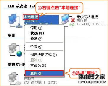 2.點(diǎn)擊本地連接,選擇“屬性”: