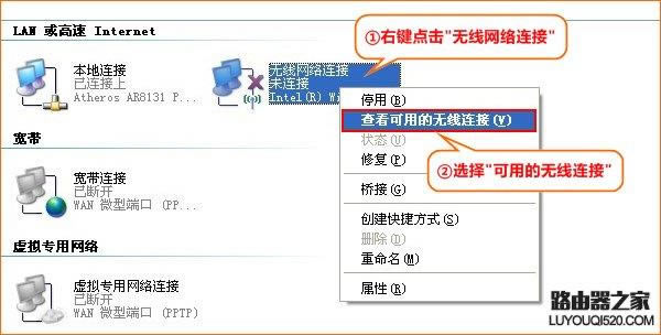 點(diǎn)擊桌面上的在線鄰居-選擇屬性-右擊無(wú)線網(wǎng)絡(luò)連接-選擇查看可用的無(wú)線連接