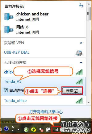 l 點(diǎn)擊桌面右下角的無(wú)線網(wǎng)絡(luò)連接圖標(biāo) ,在打開(kāi)的信號(hào)列表中選擇路由器的無(wú)線信號(hào),然后單擊連接按鈕。
