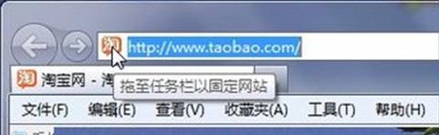 比如打開淘寶網(wǎng)首頁,用鼠標(biāo)左鍵按住地址欄左側(cè)的淘寶網(wǎng)圖標(biāo)不放手,向下拖到任務(wù)欄。